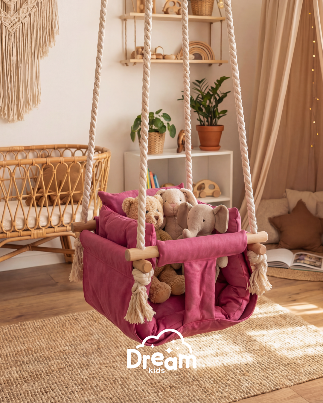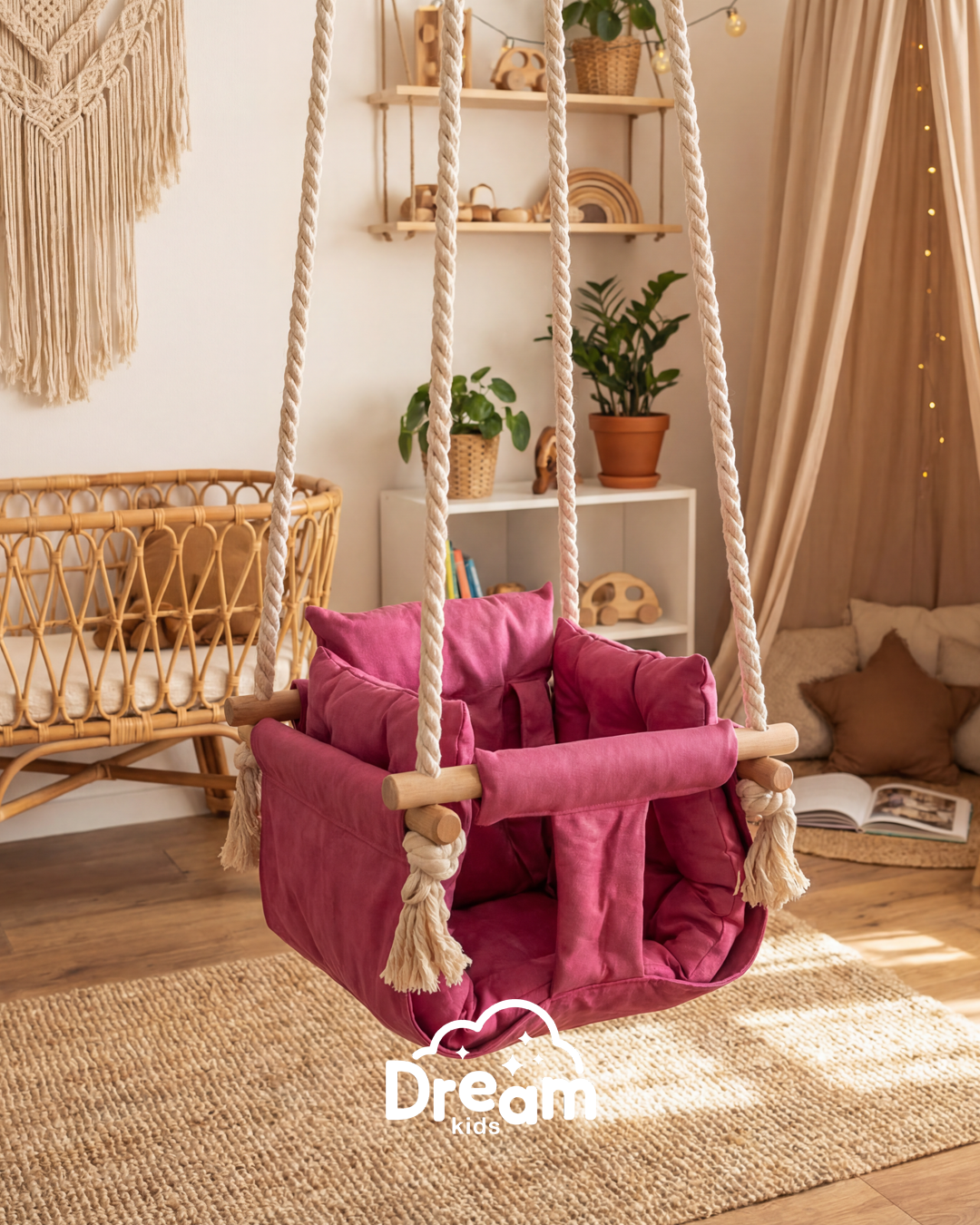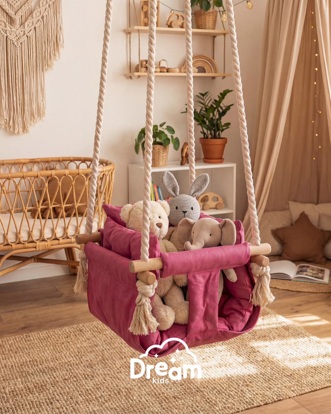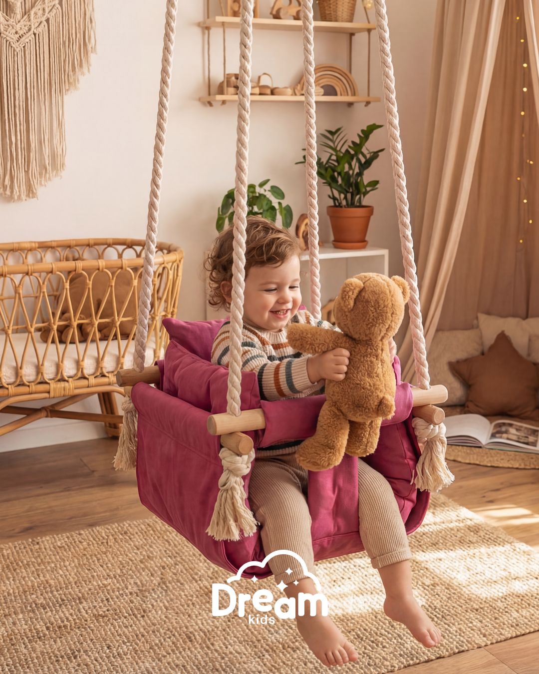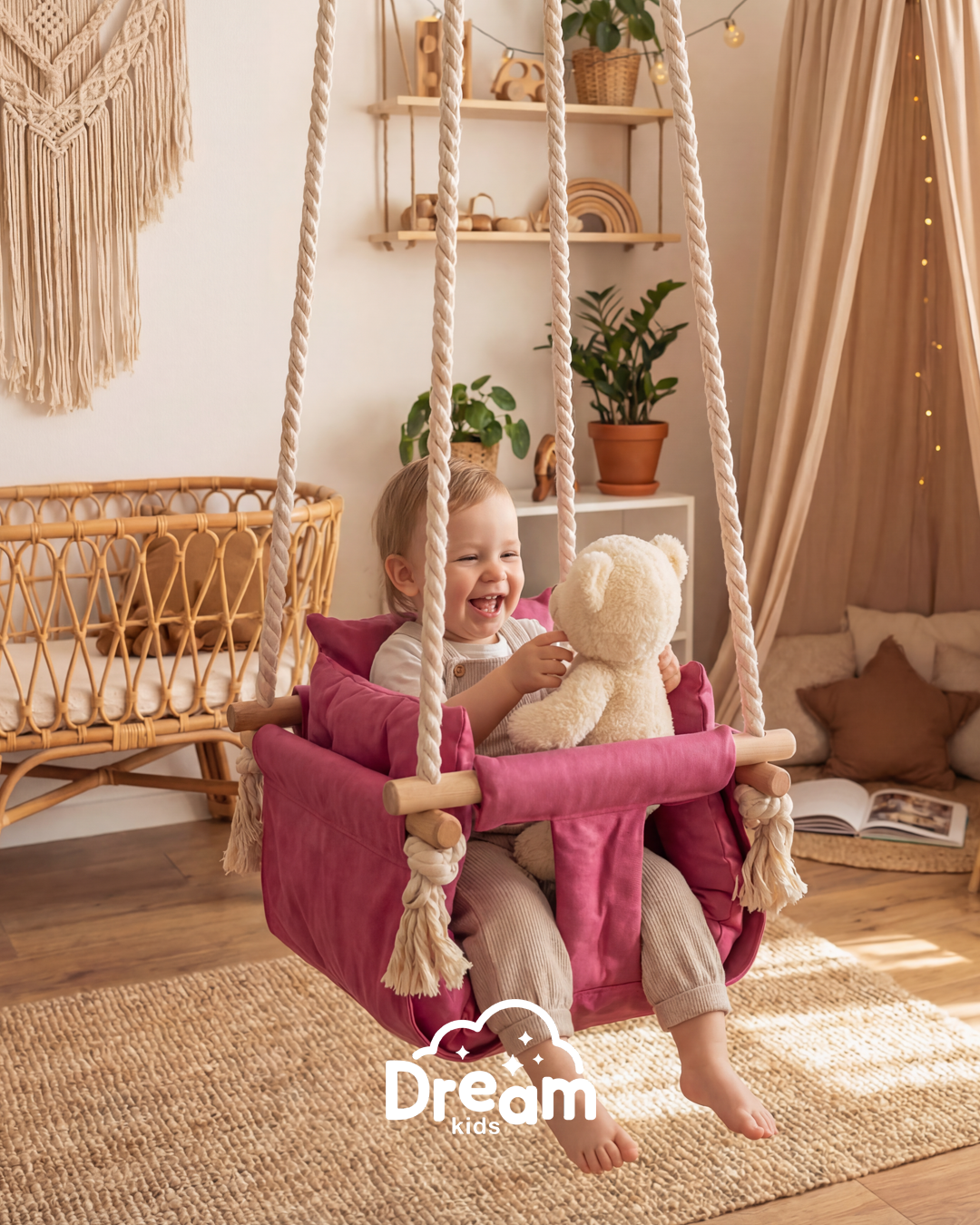 Naša ljuljaška je smišljena da pruži detetu nežno ljuljanje, osmeh i osećaj sigurnosti - bilo u kući, na terasi ili u dvorištu. Ručno izrađena od kvalitetnog drveta, mekanog materijala prijatnog na dodir i obezbeđena jakim pamučnim kanapima, ova ljuljaška kombinuje prirodne materijale sa stabilnom konstrukcijom.