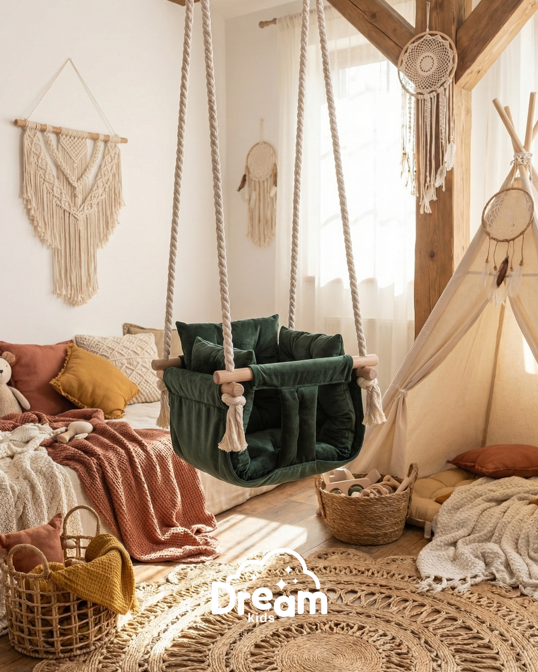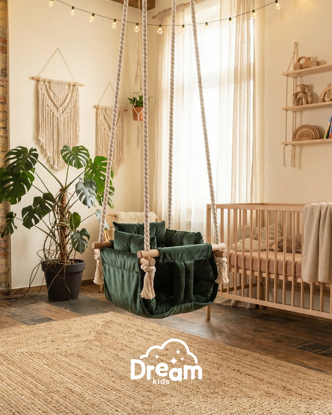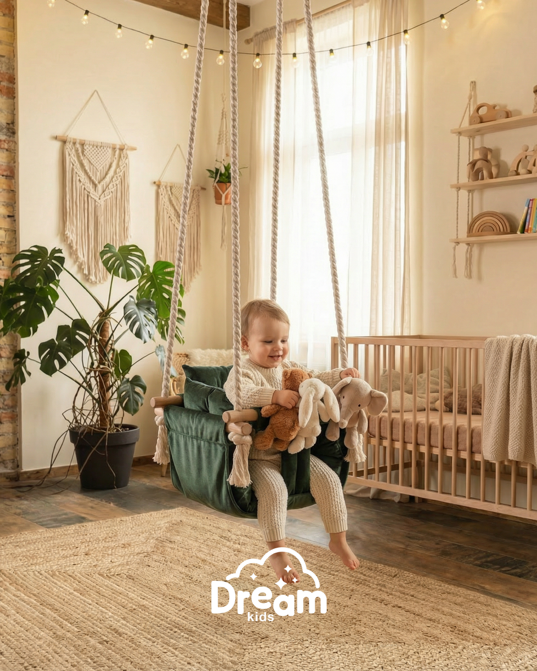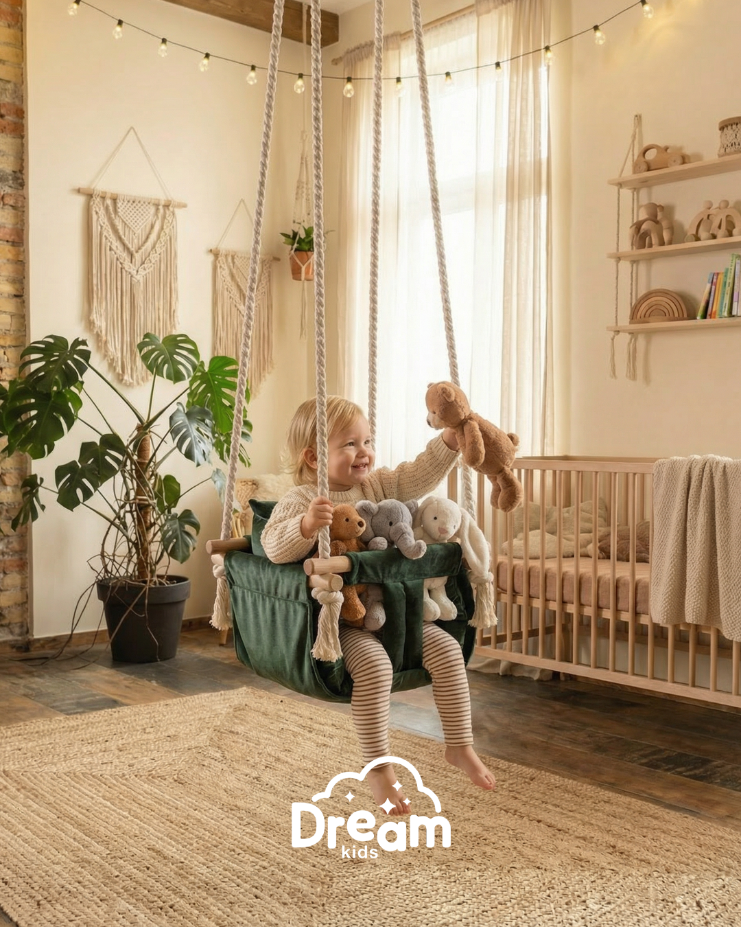 Naša ljuljaška je smišljena da pruži detetu nežno ljuljanje, osmeh i osećaj sigurnosti - bilo u kući, na terasi ili u dvorištu. Ručno izrađena od kvalitetnog drveta, mekanog materijala prijatnog na dodir i obezbeđena jakim pamučnim kanapima, ova ljuljaška kombinuje prirodne materijale sa stabilnom konstrukcijom.